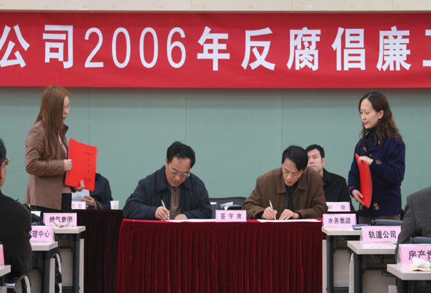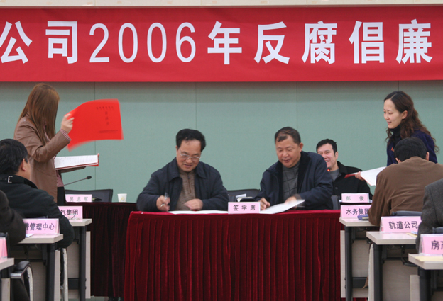 2月14日,公司在4樓大會(huì)議室召開了2006年反腐倡廉工作會(huì)議。此次會(huì)議是為了認(rèn)真學(xué)習(xí)貫徹中央和省市反腐倡廉工作會(huì)議精神、總結(jié)城投集團(tuán)公司2005年黨風(fēng)廉政建設(shè)、反腐敗工作和研究部署2006年反腐倡廉工作召開的。會(huì)議進(jìn)行了三項(xiàng)議程:一是黨委副書記、紀(jì)委書記吳志軍同志作題為《全面履行職責(zé),加大防治力度,深入推進(jìn)黨風(fēng)廉政建設(shè)和反腐敗工作》的工作報(bào)告;二是黨委書記、董事長吳長均同志與所屬各單位黨風(fēng)廉政建設(shè)第一責(zé)任人簽訂黨風(fēng)廉政建設(shè)責(zé)任書;三是吳長均同志就如何深入推進(jìn)城投集團(tuán)公司黨風(fēng)廉政建設(shè)作重要講話。