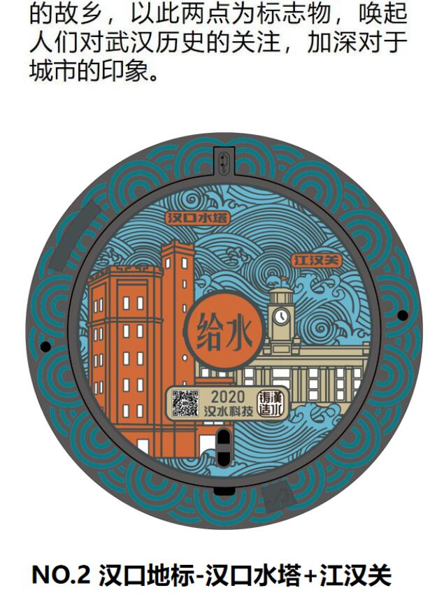 武漢大學(xué)城市設(shè)計學(xué)院鄧俊教授及其團隊,是此次文化井蓋的設(shè)計方之一。自2021年8月著手設(shè)計開始,先后調(diào)研了國內(nèi)多座城市的文化井蓋創(chuàng)意,最終確定將百年武水的企業(yè)文化與武漢三鎮(zhèn)、兩江四岸獨特的地理條件、地標(biāo)建筑和歷史人文相融合,按“城市地標(biāo)類”“重點保障類”“紅色印記類”設(shè)計制作系列文化井蓋,并進行定向衍生品開發(fā)。“我們希望通過小小的井蓋,展示城市的文化自信,講好武漢發(fā)展的故事?!蔽錆h市城投集團所屬水務(wù)集團下屬漢水科技負責(zé)人介紹,“漢水”系列井蓋的設(shè)計理念專注提煉漢派文化元素,為武漢高質(zhì)量發(fā)展的道路佩戴“城市徽章”。目前,水務(wù)集團正計劃在其他地標(biāo)建筑所在區(qū)域裝設(shè)相對應(yīng)的文化井蓋。
